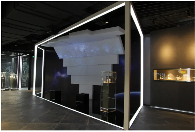 二層為鐘表文化體驗展廳,該展廳由五個部分組成:臨展區(qū):預留投影面、展柜位等空間,滿足臨時主題展覽靈動可變的展示需求。多媒體互動區(qū):通過聲光電一體化的多媒體系統(tǒng)介紹腕表的歷史與設計演變。手表材料與機芯展示區(qū):通過空間沉浸式造景設計對手表機芯及手表不同結構材料進行展示。機械互動體驗區(qū):通過空間造景和多媒體展示,打造虛實結合的體驗場景來介紹手表機械裝置和工藝。手作體驗區(qū):手表拼裝體驗。