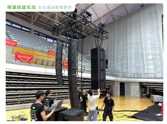 音響團(tuán)隊(duì)制作了T型桁架便于更準(zhǔn)確的固定線陣列的吊掛位置。在體育館上方,共吊掛了6組音箱,單側(cè)吊掛3組,一組由12只EVU-2062/95組成,覆蓋正前方的領(lǐng)導(dǎo)區(qū)域與看臺(tái)區(qū)域;另一組又8只EVU-2062/95組成,朝向外側(cè)45度,用于覆蓋側(cè)面的看臺(tái)觀眾區(qū);最后一組為4只EVU-2062/95,吊掛在全頻音箱后方,提供系統(tǒng)低頻能量的補(bǔ)充。