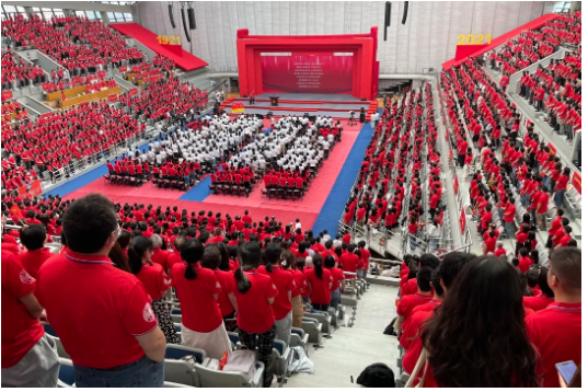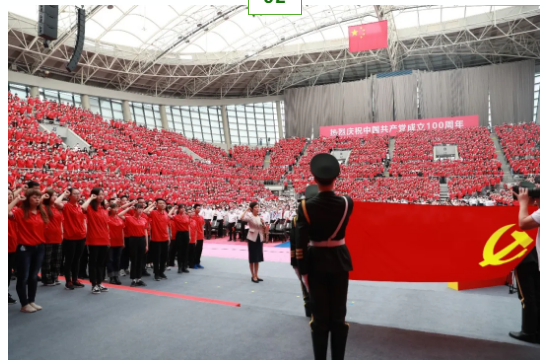活動(dòng)當(dāng)天,主持人宣布慶祝大會(huì)正式開始,全體起立,高唱國歌,重溫入黨誓詞,現(xiàn)場(chǎng)氣氛激昂、人心振奮。