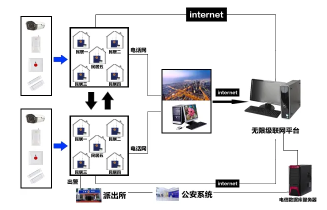 周邊防范:來訪者通過別墅門口機呼叫,業(yè)主確認后開門,其他非法入侵都會引起警報(別墅門口機和大門紅外對射關(guān)聯(lián),開鎖后撤防,上鎖后,自動布防)。