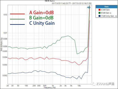 對于數字調音臺,我們不僅要關心話放增益在0dB時的THD+N比率,還需要了解到,話放增益在不同位置時的情況,因為這是使用中的實際情形。話放的增益在不同大小時,其引入的噪音和失真也是不同的,了解這一點對于用戶正確設置增益也很有參考意義。