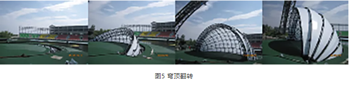 室外表演或?qū)嵕把莩鐾枰蟮奈枧_(tái)設(shè)備,提供與演出環(huán)境相適應(yīng)的大型表演舞臺(tái),并根據(jù)演出內(nèi)容進(jìn)行實(shí)時(shí)轉(zhuǎn)換。常規(guī)的平移、升降已無法滿足需求,需要平移、旋轉(zhuǎn)、傾斜、升降等運(yùn)動(dòng)形式的組合,實(shí)現(xiàn)大型舞臺(tái)場(chǎng)景的變化。如云南“希夷之大理”的旋轉(zhuǎn)升降組合穹頂翻轉(zhuǎn)技術(shù)的應(yīng)用。其主舞臺(tái)由旋轉(zhuǎn)相切的圓形組成,天棚穹頂是舞臺(tái)整體眼睛創(chuàng)意的眼珠,翻轉(zhuǎn)升起后可以作為投影幕使用。其中,五瓣穹頂既要相互分離,還要互相支持依靠,保證輕薄球面結(jié)構(gòu)的整體穩(wěn)定和變形控制,采用主次骨架結(jié)構(gòu)、同軸旋轉(zhuǎn)、液壓頂推、滾動(dòng)支撐、分離掛鉤等方法,實(shí)現(xiàn)穹頂翻轉(zhuǎn),如圖5所示。采用同心軌道、多點(diǎn)浮動(dòng)鏈輪驅(qū)動(dòng)、虛擬圓心定位、電纜滑車供電、液壓系統(tǒng)隨動(dòng)等方式,實(shí)現(xiàn)大型圓弧轉(zhuǎn)臺(tái)的360°旋轉(zhuǎn);采用自主液壓同步控制軟件,有效解決了不同液壓驅(qū)動(dòng)設(shè)備的同步問題,穩(wěn)態(tài)同步控制精度小于5 mm。