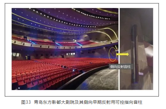 筆者作為本系統(tǒng)的主要設(shè)計(jì)實(shí)施人員之一,感覺系統(tǒng)中采用的同軸寬錐形覆蓋的揚(yáng)聲器對(duì)于最終聽覺效果的提升起到了積極的推動(dòng)作用,這種指向角度選型,進(jìn)一步降低了揚(yáng)聲器本身各單元間的相位響應(yīng)問(wèn)題,同時(shí)平滑了整個(gè)主動(dòng)系統(tǒng)所提供的輔助聲能在廳堂內(nèi)的均勻度。此外,側(cè)向反射聲采用電子可變指向音柱,其水平指向?qū)挕⒋怪敝赶蛐哉奶攸c(diǎn)可在水平維度上實(shí)現(xiàn)更為廣泛的觀眾席覆蓋,而在垂直維度上實(shí)現(xiàn)更遠(yuǎn)距離的觀眾席覆蓋,對(duì)于如此體量巨大的廳堂而言,這些特性都有效地提高了側(cè)向反射聲能的針對(duì)性和平順度。青島東方影都大劇院內(nèi)部實(shí)景及其側(cè)向早期反射用可控指向音柱可見圖33。