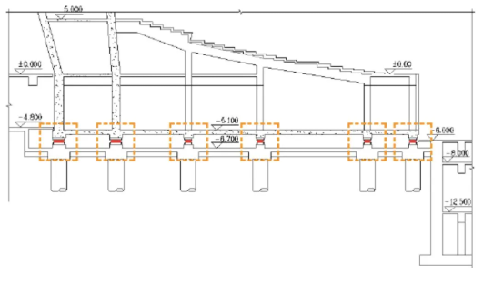 其次,歌劇廳建造時需要對地基作特別處理以消除結(jié)構(gòu)傳播噪聲(ground-bornenoise),即附近地鐵、路面交通等振動帶來的噪音。圖中黃色虛線框起的阻尼器將結(jié)構(gòu)震動帶來的動能轉(zhuǎn)化為熱能,加速垂直方向振動頻率的衰減,從而降低噪聲影響。