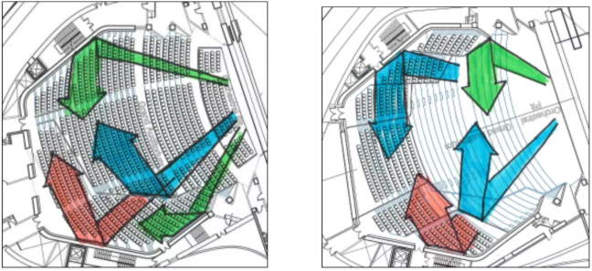 下圖是歌劇廳的一階反射聲,即聲音從舞臺擴(kuò)聲器發(fā)出后經(jīng)過第一次反射的路徑分析。從各個箭頭的指向與長度可以看出,聲音到達(dá)各區(qū)域座位距離、時間相當(dāng),也就是各區(qū)域觀眾都能有相似的聽覺體驗。