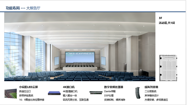 多功能廳主顯示屏為P2.5,輔助顯示屏為P1.25;