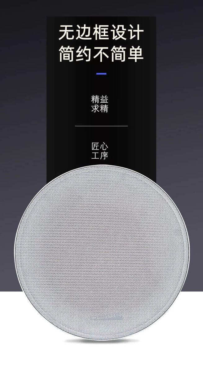 從外形上,我們圍繞著極簡主義風(fēng)格設(shè)計,嚴(yán)選金屬材質(zhì),硬度較強,能夠大大減少諧振的產(chǎn)生,將低、中、高三頻還原的更精準(zhǔn)。網(wǎng)罩采用了無邊框設(shè)計,加上顏色純黑的磨砂質(zhì)感,視覺上可塑性強,更好契合墻面和天花。
