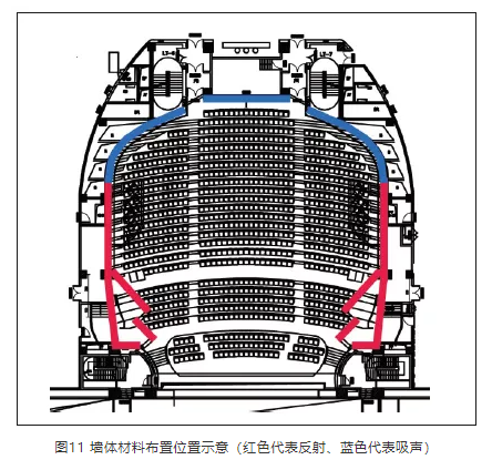 根據(jù)確定的混響時間值,對主劇場觀眾廳進(jìn)行聲學(xué)材料布置,同時遵循室內(nèi)聲學(xué)材料布置原則,確定觀眾廳空間以下部位的材料及構(gòu)造做法。