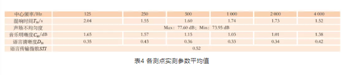 根據(jù)混響時間測量規(guī)范,在觀眾廳內(nèi)共布置17個測點,對主劇場進(jìn)行空場竣工檢測,各參數(shù)檢測結(jié)果見表4。