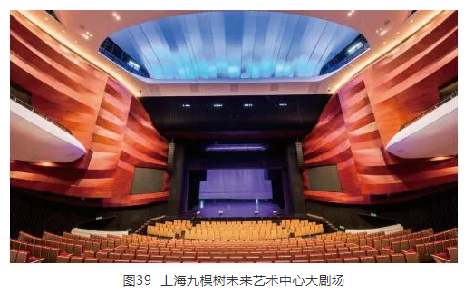上海九棵樹未來藝術(shù)中心于2019年10月正式運營,其主劇場設(shè)有兩層觀眾區(qū),共提供1 200個座位,主要用于話劇、現(xiàn)代音樂及音樂劇演出,并需兼顧古典音樂會等,具有一定的多功能性,因此,建筑本身的最終固有中頻混響時間設(shè)定為1.2 s,并通過安裝MeyerSound Constellation聲學(xué)環(huán)境可變系統(tǒng),以使該劇場在聲學(xué)條件上滿足其他的功能用途。上海九棵樹未來藝術(shù)中心主劇場的內(nèi)部實景如圖39所示。
