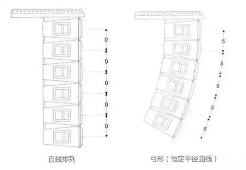 線陣列揚聲器系統(tǒng)是由一列單元箱組成,這些單元箱按一定規(guī)則排列,根據(jù)聲場需要可以排成直線、弓形(恒定半徑曲線)、“J”字形和漸開線等。