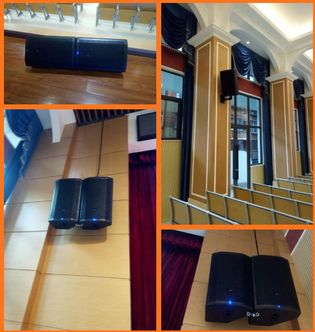 綜合報告廳的需求,音響均采用了美國JBL PRX800W智能有源揚聲器系統(tǒng),主擴聲左右聲道各采用兩只PRX815W,單只聲壓可達137dB,報告廳輔助補聲采用壁掛方式,采用了底部角度可選雙孔設(shè)計的PRX812W,演講臺上擺放四只PRX812W作為流動返送,舞臺下方內(nèi)嵌擺放兩只PRX818XLFW作為低音補充。