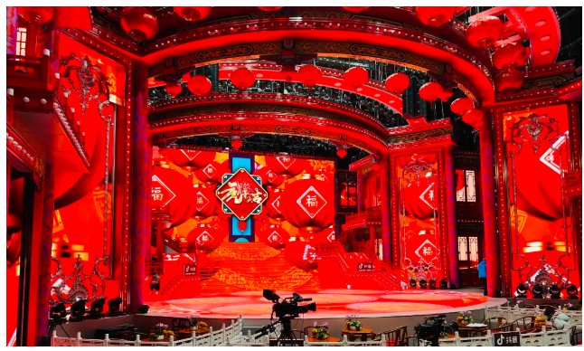 此次遼視春晚舞美設計較為復雜,舞臺頂部使用了喜慶的中式風格,有中式建筑的頂部橫梁,還懸掛有多只大紅燈籠。為滿足拍攝的美觀需求,曾多次調(diào)整主擴系統(tǒng)的吊裝高度和位置,最終主系統(tǒng)被吊掛在舞臺兩側(cè)上空10.5米的高度,隱藏在中式風格弧型橫梁的后部,毫無違和感。