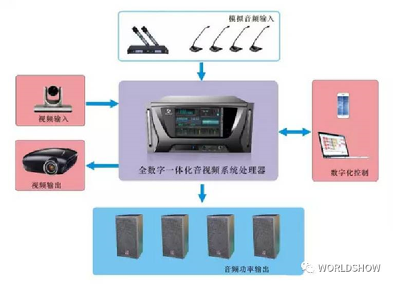 輸出端可以獨(dú)立完成對(duì)輸出端音頻的整理,包括音箱的標(biāo)準(zhǔn)化和聲學(xué)環(huán)境的補(bǔ)償處理、視頻終端的多窗口拼接處理、傳輸補(bǔ)償和控制系統(tǒng)的多種格式的控制信號(hào)的輸出等等。