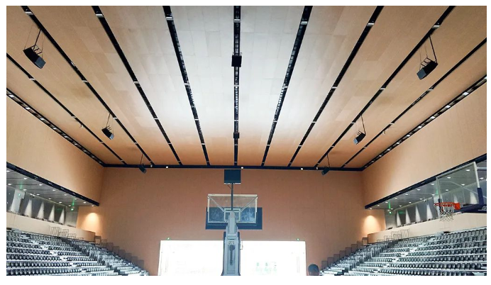 其中一層多功能綜合館,面積超過1200平方米,包含2000個坐席和3個籃球全場,可以承辦中小型賽事和活動。在擴聲系統(tǒng)的選擇上,面臨著場館層面積大,層高深,混響時間長,設(shè)備選擇需要滿足大聲壓級、高靈敏度、適合長距離投射和體積輕巧能減少高空懸掛的負荷,確保滿足極佳的指向性控制,保證音色的一致性,具備優(yōu)異的安全性和穩(wěn)定性。