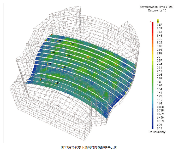 從圖13可以看出,盡管演奏廳內少量位置存在混響時間偏長的情況,但整體來看,廳內混響時間分布比較均勻。